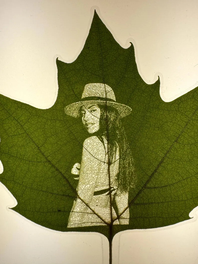 🔬 Baskı değil, özel kazıma tekniği ile işlenir; fotoğraf detayları yaprağın doğal dokusu üzerinde sanatsal bir görünüm kazanır.
