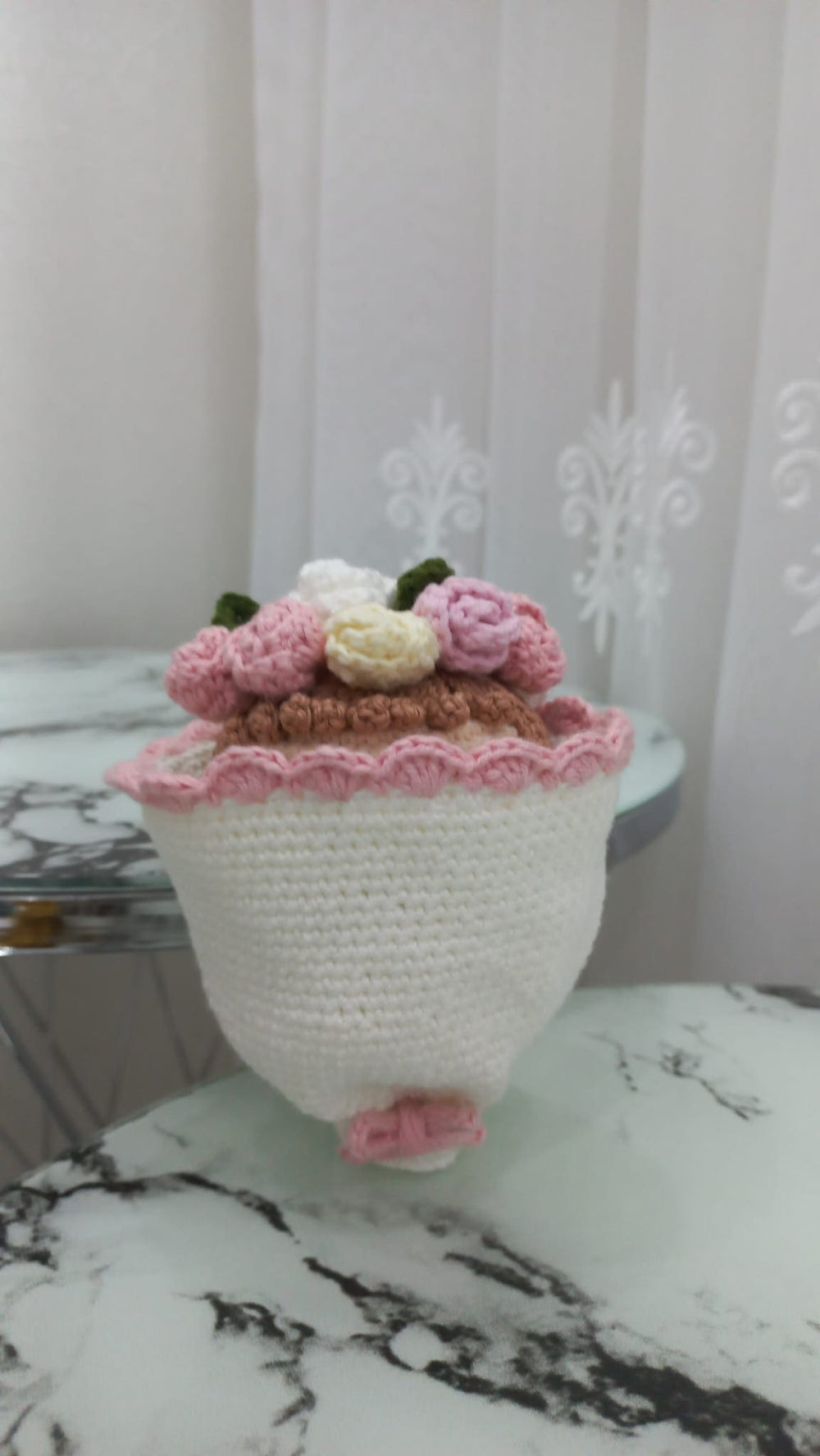 Çiçek buketi gibi görünen bu tasarım, ters çevrildiğinde içinden minik bir bebek çıkan el yapımı bir sürprizdir.